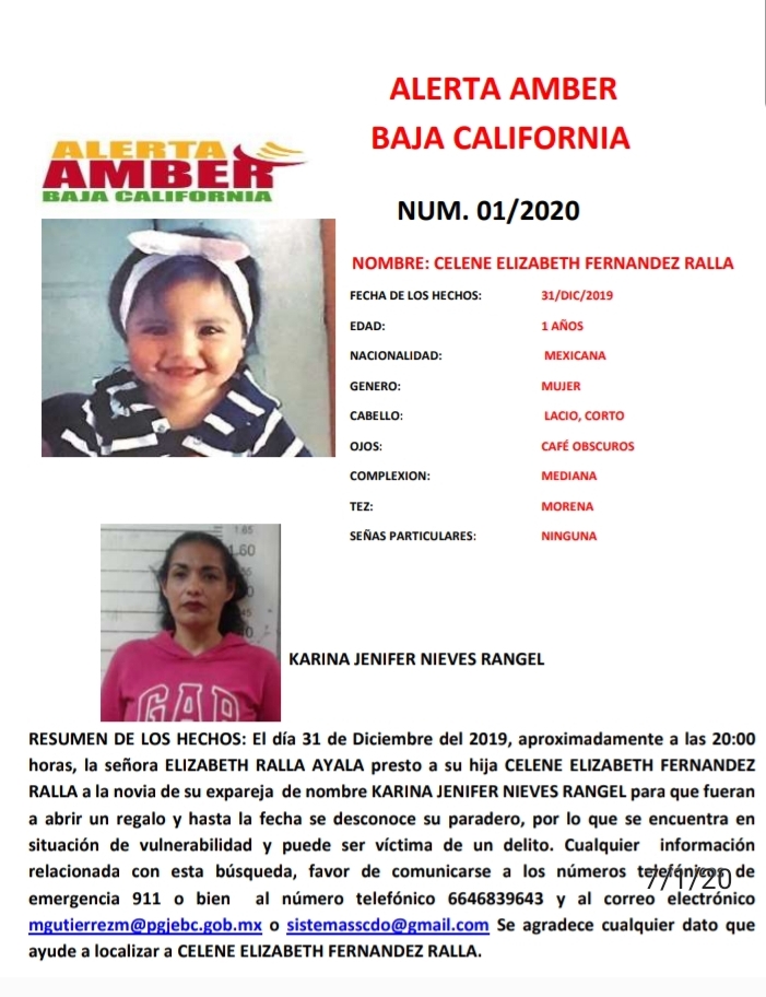 TIJUANA.- La Fiscalía General de Baja California informa que se ha activado la Alerta Amber para localizar a la menor Celene Elizabeth Fernández Ralla de 1 año de edad.