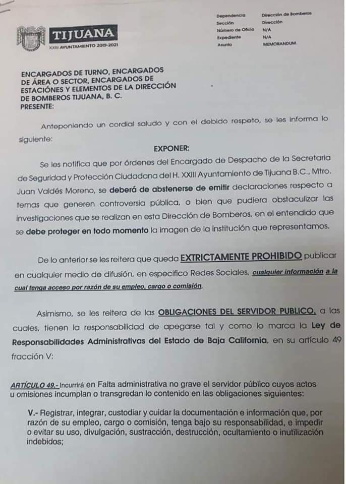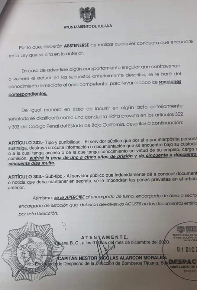 Tijuana, Baja California, a 10 de diciembre de 2020.-* El XXIII Ayuntamiento de Tijuana informa la destitución del encargado de despacho de la Dirección de Bomberos, Néstor Alarcón Morales, ya que las acciones emprendidas en contra de la corporación no representan a este Gobierno, informó el presidente municipal, Arturo González Cruz.