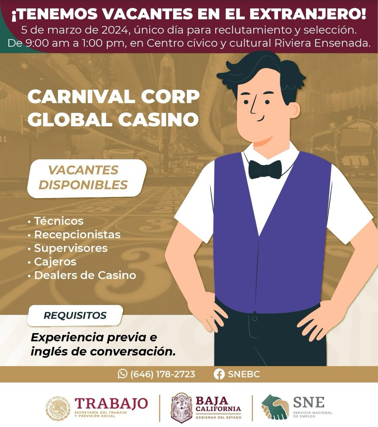 ENSENADA, 26 de Febrero de 2024.- .- La Secretaría del Trabajo y Previsión Social (STPS), a través del Servicio Nacional de Empleo (SNE), realizarán una Feria de Empleo el próximo martes 5 de marzo, de 9:00 de la mañana a 1:00 de la tarde en el Centro Cultural Riviera, para reclutamiento y selección de personal, del grupo turístico “Carnival Corp. Global Casino”.