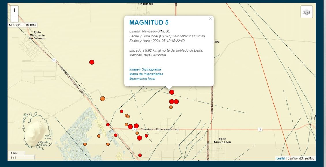 MEXICALI, Domingo, 12 de mayo de 2024.- La Coordinación Estatal de Protección Civil de Baja California informa, con datos proporcionados por el CICESE, que se registró un sismo magnitud 5 a 9.8 kilómetros del poblado Delta Mexicali, generando percepción en la zona urbana del municipio y su valle.